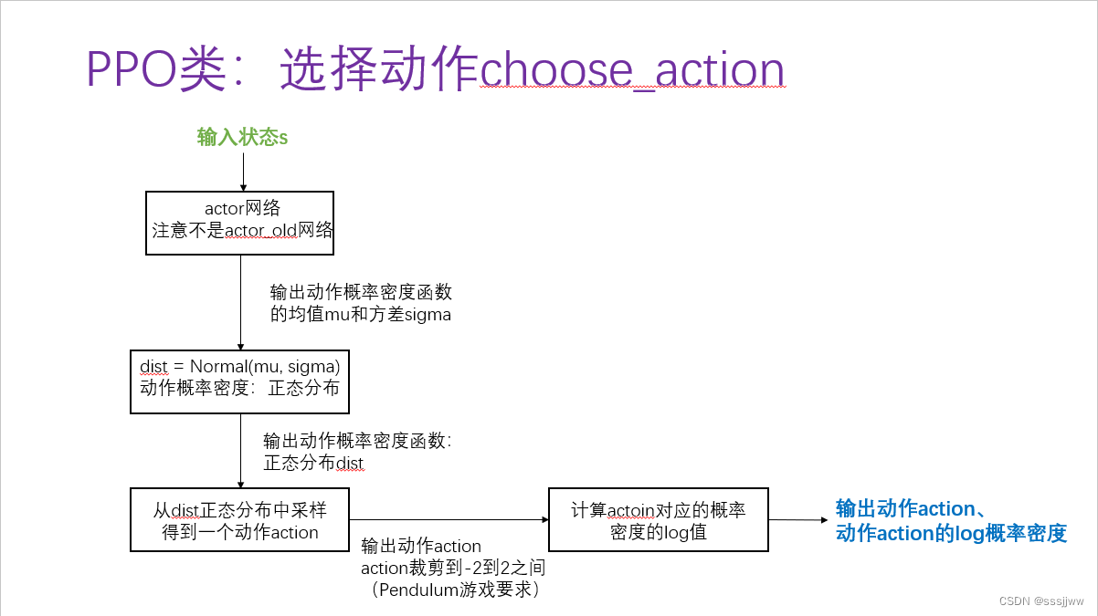 输入状态s,通过actor网络选择动作,actor网络输出动作概率密度函数中的均值和方差,假设的是概率密度函数服从的是正态分布,然后基于正态分布进行采样获得动作,该动作还需要经过裁剪到一定的范围内,之后计算动作对应的概率密度的log值。最终输出动作和该动作对应的log 概率密度