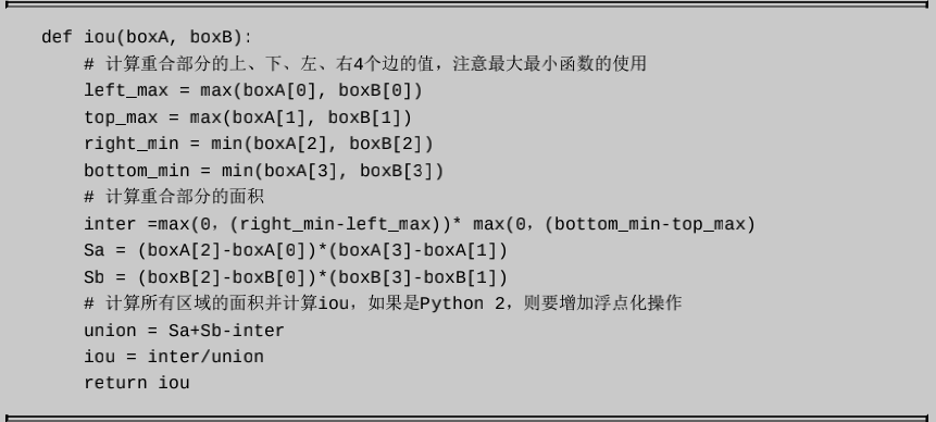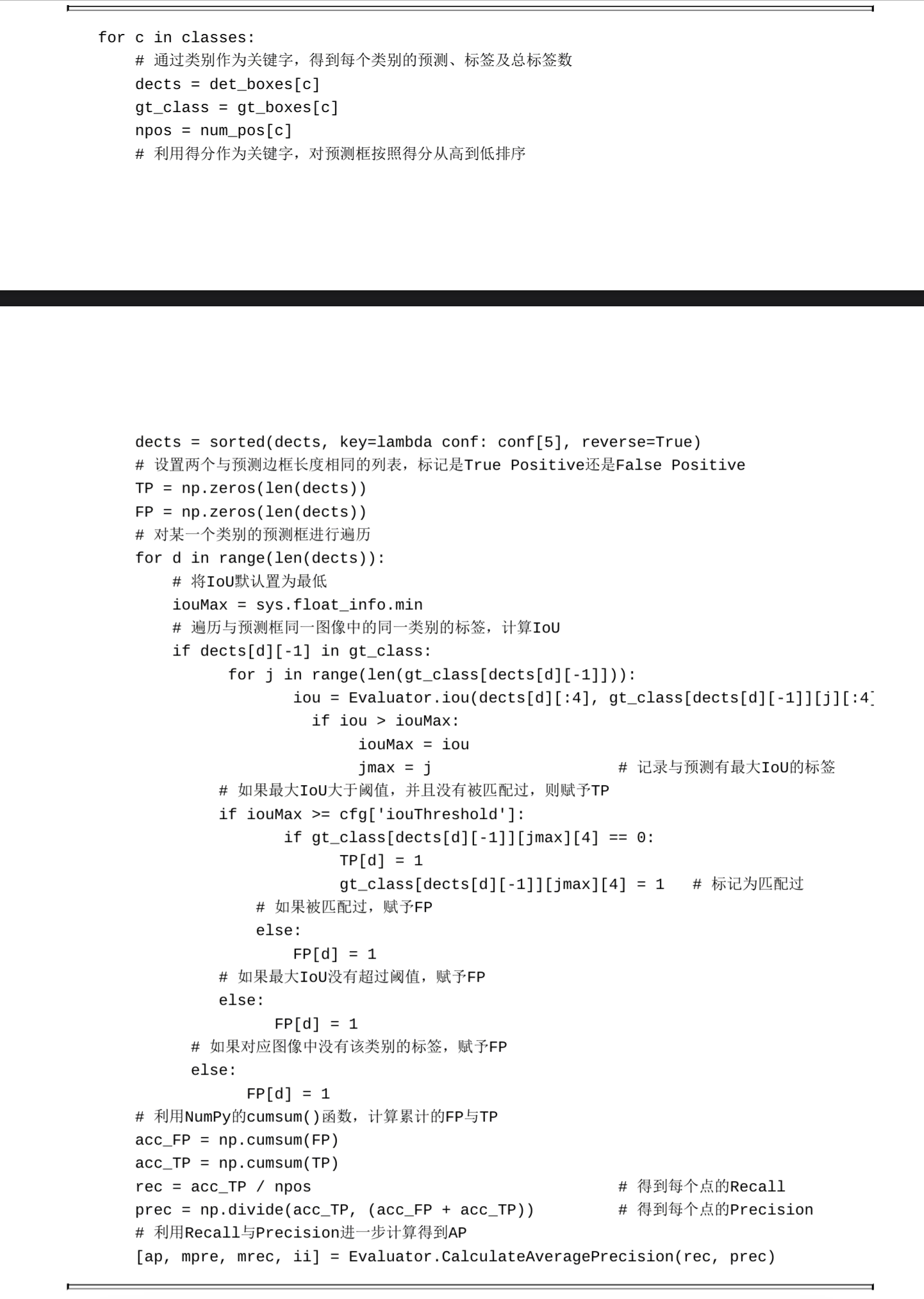 从公式中可以看出,AP代表了曲线的面积,综合考量了不同召回 率下的准确率,不会对P与R有任何偏好。每个类别的AP是相互独立 的,将每个类别的AP进行平均,即可得到mAP。严格意义上讲,还需 要对曲线进行一定的修正,再进行AP计算。除了求面积的方式,还可 以使用11个不同召回率对应的准确率求平均的方式求AP。 下面从代码层面详细讲述AP求解过程。假设当前经过标签数据与 预测数据的加载,我们得到了下面两个变量: