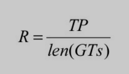 在遍历完所有的预测框后,我们会得到每一个预测框的属性,即TP或FP。在遍历的过程中,我们可以通过当前TP的数量来计算模型的召回率(Recall,R),即当前一共检测出的标签框与所有标签框的比值