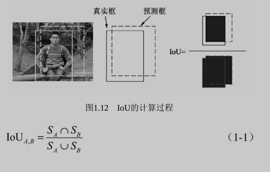 对于一个检测器,我们需要制定一定的规则来评价其好坏,从而选择需要的检测器。对于图像分类任务来讲,由于其输出是很简单的图像类别,因此很容易通过判断分类正确的图像数量来进行衡量。物体检测模型的输出是非结构化的,事先并无法得知输出物体的数量、位置、大小等,因此物体检测的评价算法就稍微复杂一些。对于具体的某个物体来讲,我们可以从预测框与真实框的贴合程度来判断检测的质量,通常使用IoU(Intersection of Union)来量化贴合程度。IoU的计算方式如图1.12所示,使用两个边框的交集与并集的比值,就可以得到IoU,公式如式(1-1)所示。显而易见,IoU的取值区间是[0,1],IoU值越大,表明两个框重合越好。