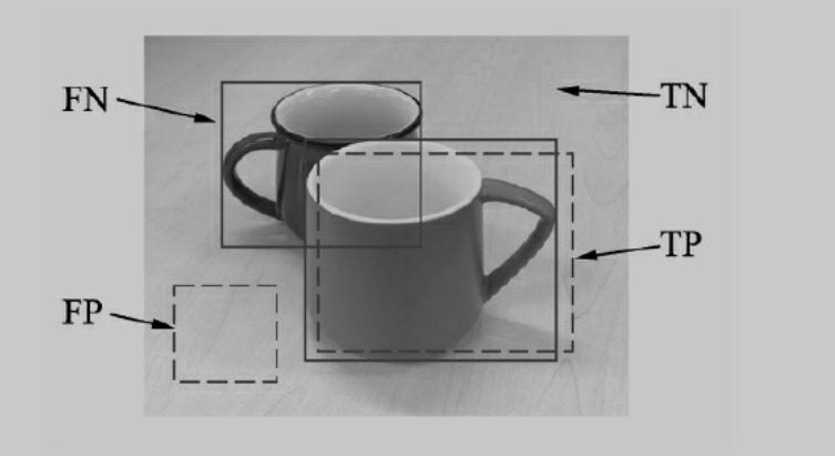 - 漏检框FN(False Negative):本来需要模型检测出的物体,模型没有检测出,如图1.13中左上方的杯子。