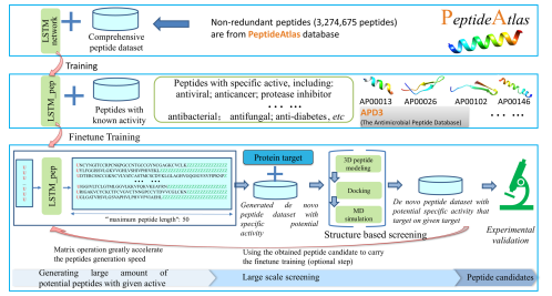 利用深度学习可以生成大量潜在的生物活性肽,类似于利用获得的生物活性肽作为训练集生成从头化合物。尽管基于深度学习的肽生成模型的可用性有限,但我们已经建立了一个LSTM模型(称为LSTM_Pep)来生成从头肽,并对模型进行微调,以生成具有特定预期治疗效益的肽。作者提出了一个筛选为给定目标生成的多肽的管道,并使用SARSCOV-2的主要蛋白酶作为概念验证。该工作揭示了开发基于深度学习的方法和管道,以有效
