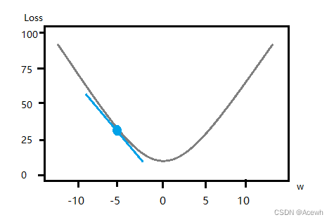 假设 w w w 的初始值是-5,我们需要使用梯度下降法来不断优化 w w w 的取值,使 l o s s loss loss 不断减少,首先应该计算 w = − 5 w=-5 w=−5 时的梯度,结果如下: