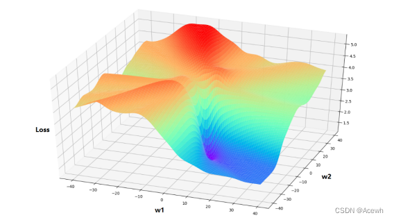 假定代价函数有两个参数 w 1 , w 2 w_1,w_2 w1,w2 ,参数 w 1 , w 2 w_1,w_2 w1,w2 与代价函数 l o s s loss loss 的关系如下: