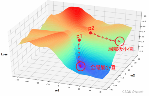 算法网络参数优化的过程,就是 w 1 , w 2 w_1,w_2 w1,w2 两个小球从初始点开始,每次移动一步,就是在向谷底移动,在向 l o s s loss loss 最小的地方移动。其中 p 1 p1 p1 最后移动到了全局最小值的位置,而 p 2 p2 p2 走到了局部极小值的位置,说明不同的参数初始值模型训练后的结果会有所不同,这是梯度下降法存在的一个缺点,一个模型多训练几次,取最好结果即可。