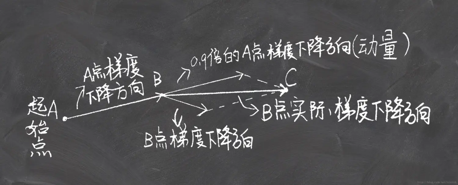 下面一张图可以很直观地表达Momentum算法的思想。举个简单例子,假设上次更新时梯度是往前走的,这次更新的梯度算出来是往左走,这变化太剧烈了,所以我们来做个折中,往左前方走。感觉上,像是上次更新还带有一定的惯性。