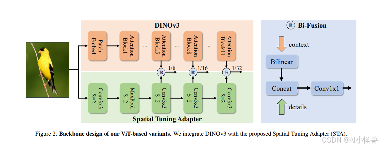 空间调谐适配器(STA):为了更好地使 DINOv3 特征适应实时目标检测,我们提出了空间调谐适配器(STA),如图 2 所示。STA 是一个全卷积网络,它集成了一个用于提取细粒度多尺度细节的超轻量级前馈网络,以及一个用于进一步增强 DINOv3 特征表示的 Bi-Fusion 算子。