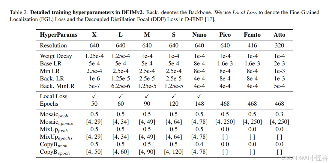 我们在表 2 中总结了训练超参数,包括输入分辨率、学习率、训练周期和 Dense O2O 设置。一个有趣的观察是,对超轻量级模型应用 FGL 和 DDF 损失会降低性能。我们将其归因于它们有限的能力和固有的较弱基线精度,这降低了自蒸馏的有效性。因此,我们在训练 Pico、Femto 和 Atto 变体时排除了这两个组成部分(即局部损失)。