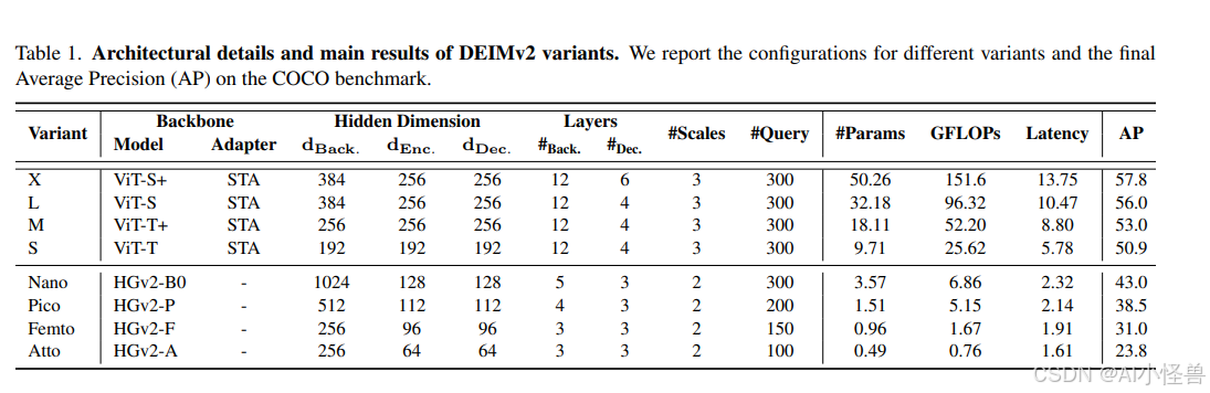 基于 ViT 的变体:对于较大的 DEIMv2 变体(S、M、L、X),我们围绕 Vision Transformer [3](ViT)系列精心设计了主干网络,以平衡模型容量和效率。对于 L 和 X 变体,我们利用了两个公开的 DINOv3 模型 [21]:ViT-Small 和 ViT-Small+,它们通过 12 层网络和 384 维隐藏大小提供了强大的语义表示。对于更轻量的 S 和 M 变体,我们直接从 ViT-Small DINOv3 蒸馏得到紧凑的主干网络 ViT-Tiny 和 ViT-Tiny+,保持了 12 层的深度,同时将隐藏层维度分别降至 192 和 256。这种设计实现了从 S → M → L → X 的平滑缩放路径,确保每个变体在适应不同效率需求的同时保持有竞争力的准确度。