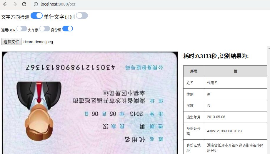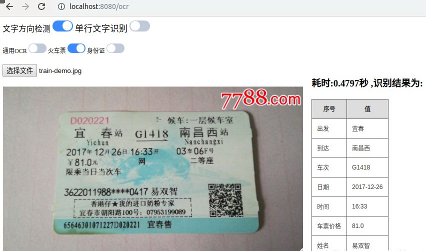 从识别效果上看还不错,接下来试一下火车票、身份证类型的识别
