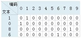 为了能够将验证码图片的文本信息输入到卷积神经网络模型里面去训练,需要将文本信息向量化编码。在这里使用“热独编码”(one-hot),即使用01编码表示文本信息。本项目的验证码文本长度为4位,验证码编码由0至9的数字组成,例如验证码文本信息为“1086”,则one-hot编码时在相应的位置标为1,其余为0,如下图: