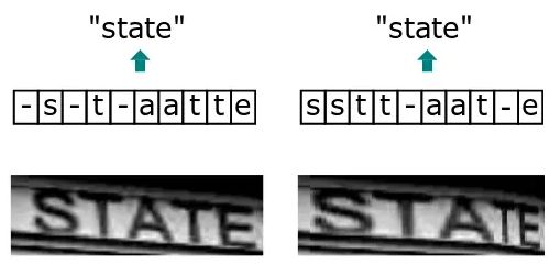 由于字符变形等原因,导致对输入图像分块识别时,相邻块可能会识别为同个结果,字符重复出现。因此,通过CTC来解决对齐问题,模型训练后,对结果中去掉间隔字符、去掉重复字符(如果同个字符连续出现,则表示只有1个字符,如果中间有间隔字符,则表示该字符出现多次),如下图所示