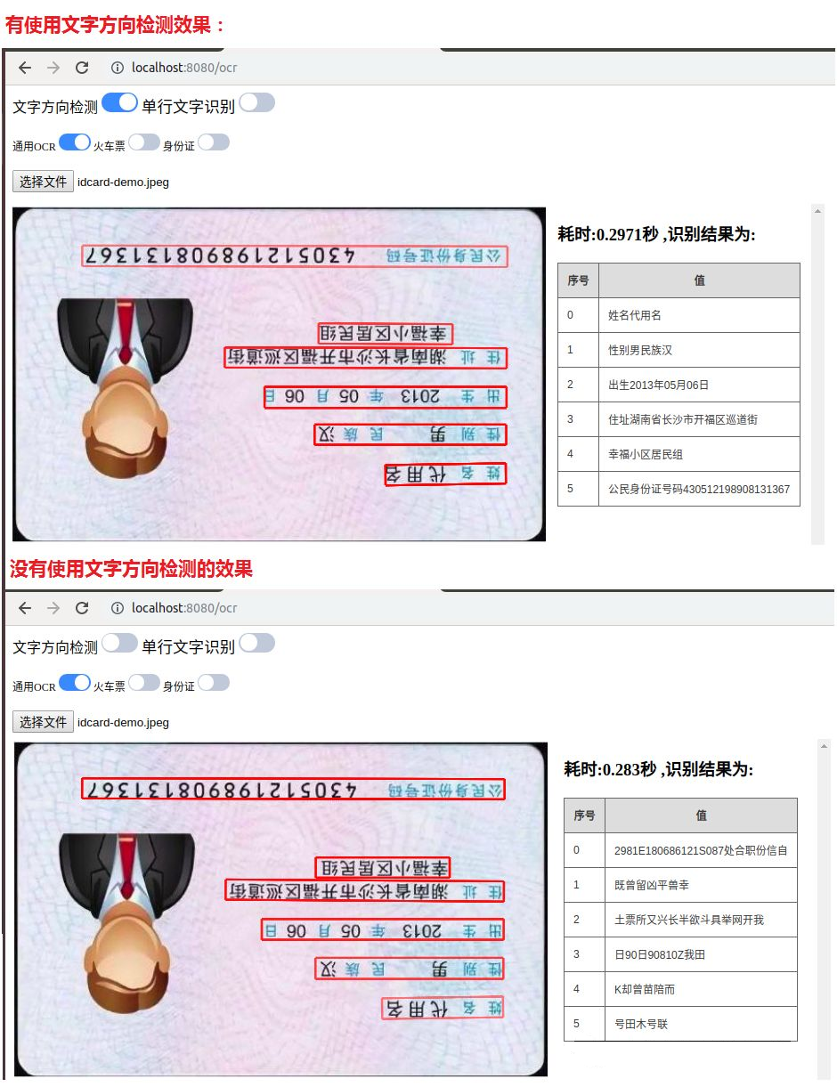 我们再比较一下,有使用文字方向检测和没有使用文字方向检测时的识别效果区别,如下图: