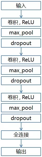 由于验证码的识别相对比较简单,借鉴LeNet的网络结构构建CNN模型,由3个卷积层和1个全连接层组成,网络结构图如下: