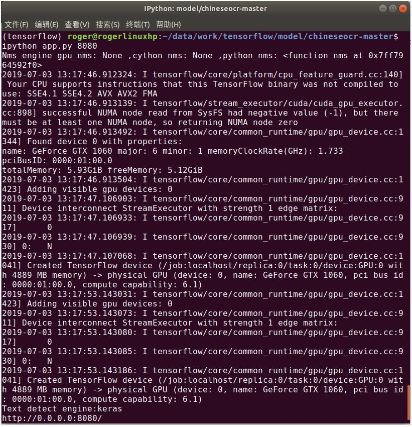 # 创建虚拟环境 conda create -n chineseocr python=3.6 pip scipy numpy jupyter ipython # 激活虚拟环境 source activate chineseocr