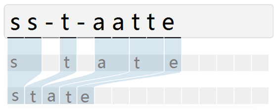 CTC(Connectionist Temporal Classifier,联接时间分类器),主要用于解决输入特征与输出标签的对齐问题。例如下图,由于文字的不同间隔或变形等问题,导致同个文字有不同的表现形式,但实际上都是同一个文字。在识别时会将输入图像分块后再去识别,得出每块属于某个字符的概率(无法识别的标记为特殊字符”-”),如下图:
