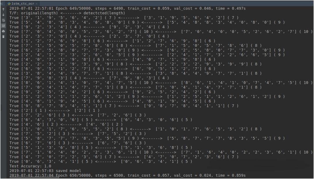 为了方便其它程序调用LSTM+CTC的识别能力,对识别能力进行封装,只需要输入一张图片,即可识别后返回结果。核心代码如下: