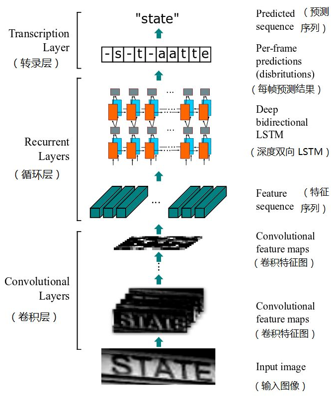 CRNN(Convolutional Recurrent Neural Network,卷积循环神经网络)是目前比较流行的文字识别模型,不需要对样本数据进行字符分割,可识别任意长度的文本序列,模型速度快、性能好。网络结构如下图所示,主要由卷积层、循环层、转录层3部分组成: