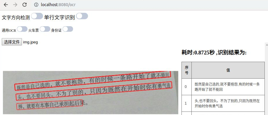 在chineseocr项目中的test目录里面自带了一些测试图片,通过上传一些图片测试识别效果,如下图: