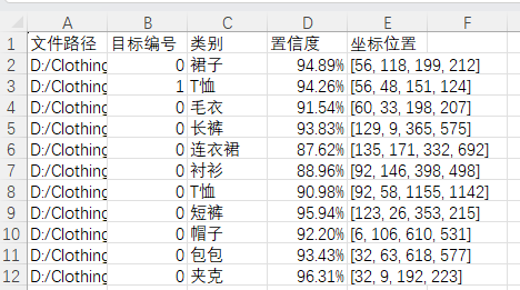 图片文件保存的csv文件内容如下,包括图片路径、目标在图片中的编号、目标类别、置信度、目标坐标位置。