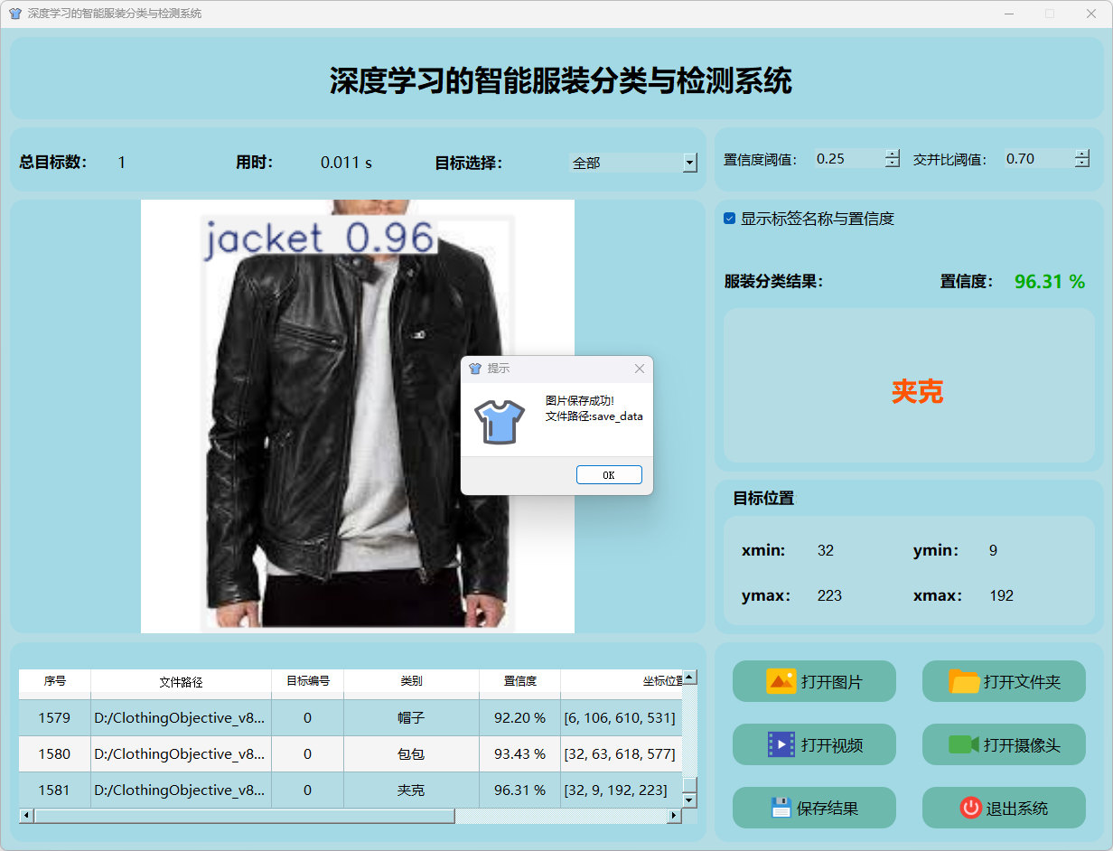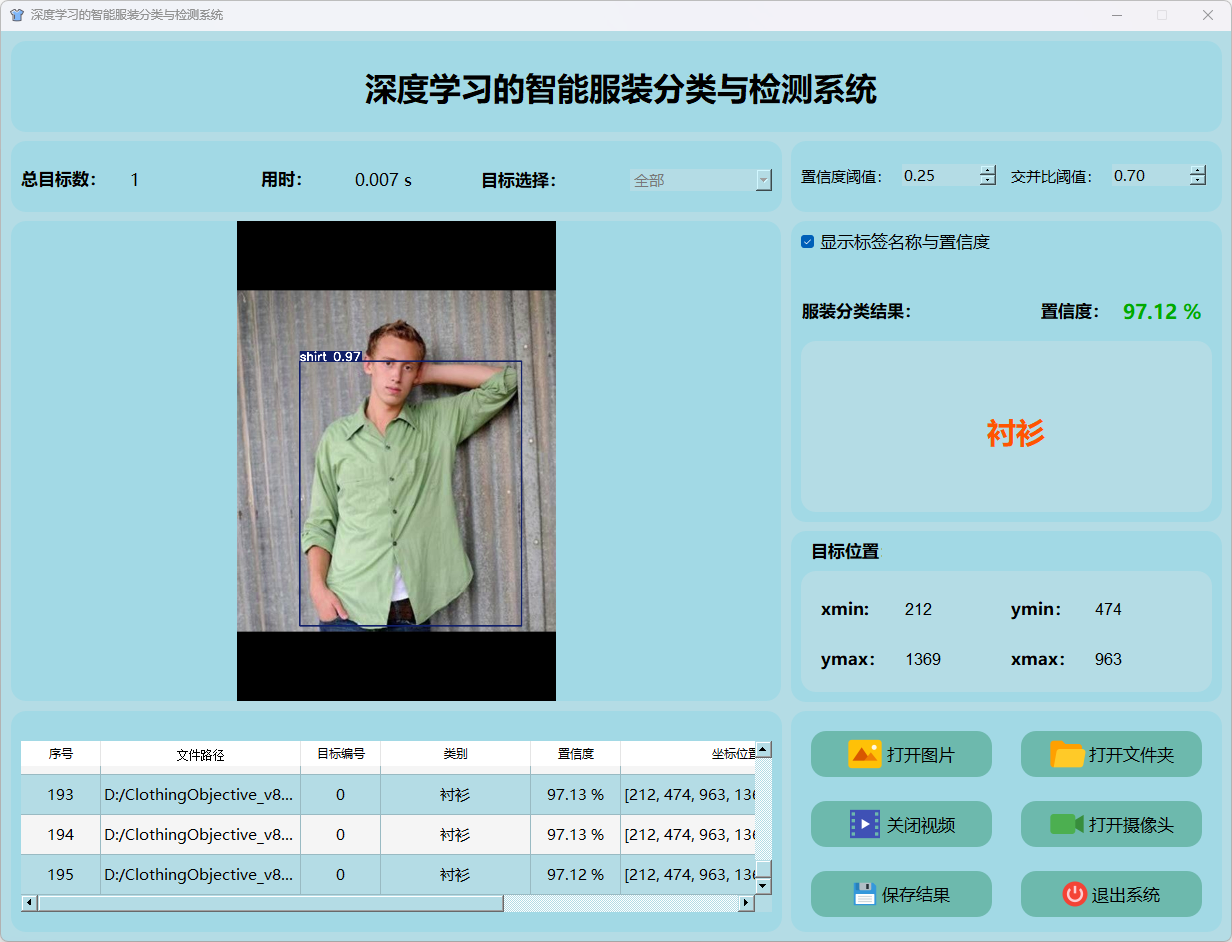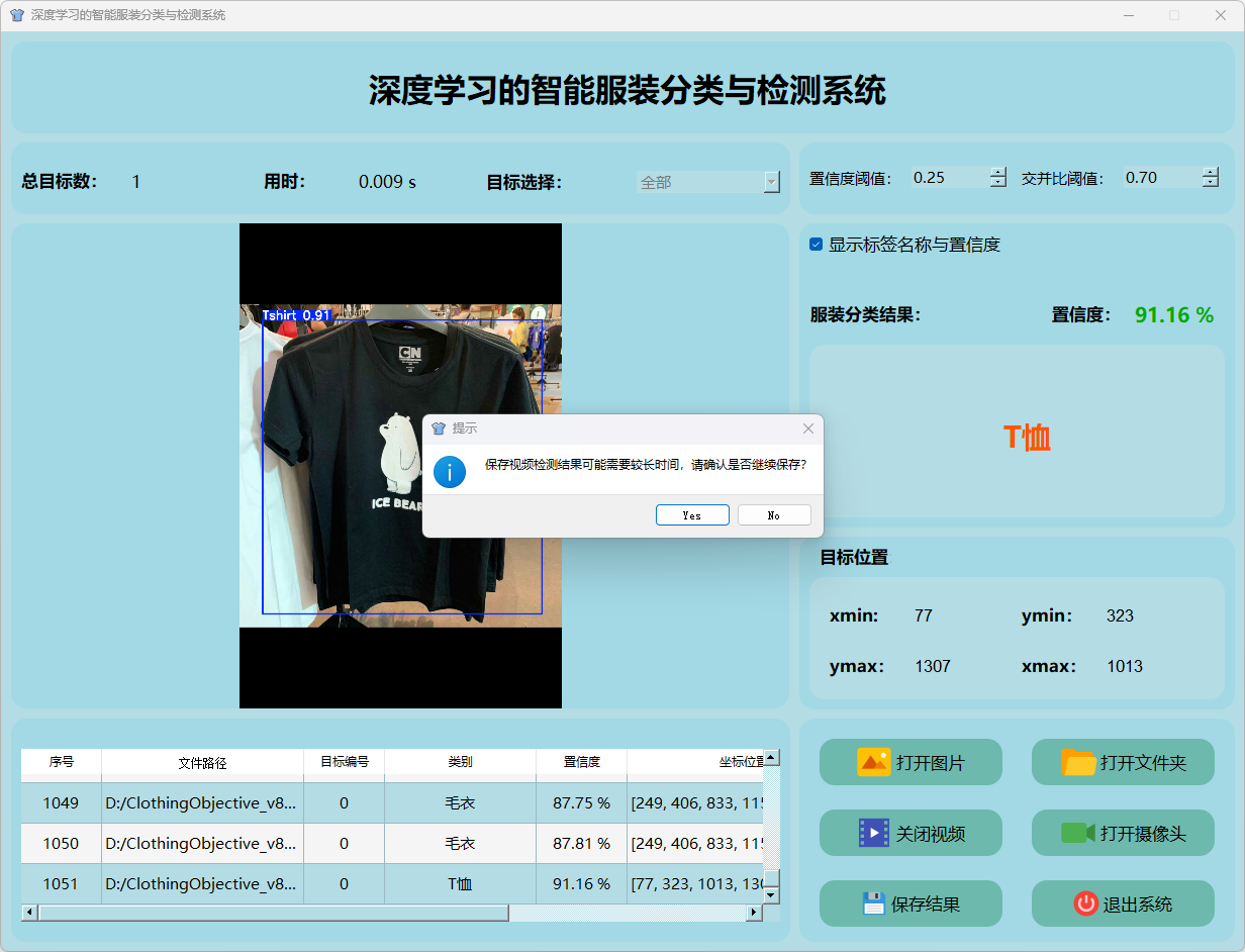检测结果:系统对视频进行实时分析,检测到服装分类目标并显示检测结果。表格显示了视频中多个检测结果的置信度和位置信息。