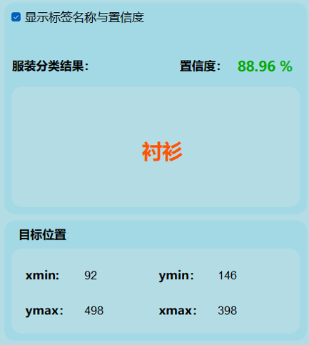 这张图展示了服装分类检测的一次检测结果,包括检测时间、检测到的种类、各行为的置信度、目标的位置信息等。用户可以通过界面查看并分析检测结果,提升服装分类检测的效率。