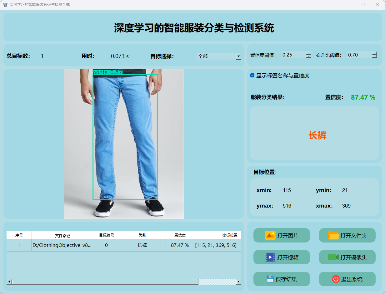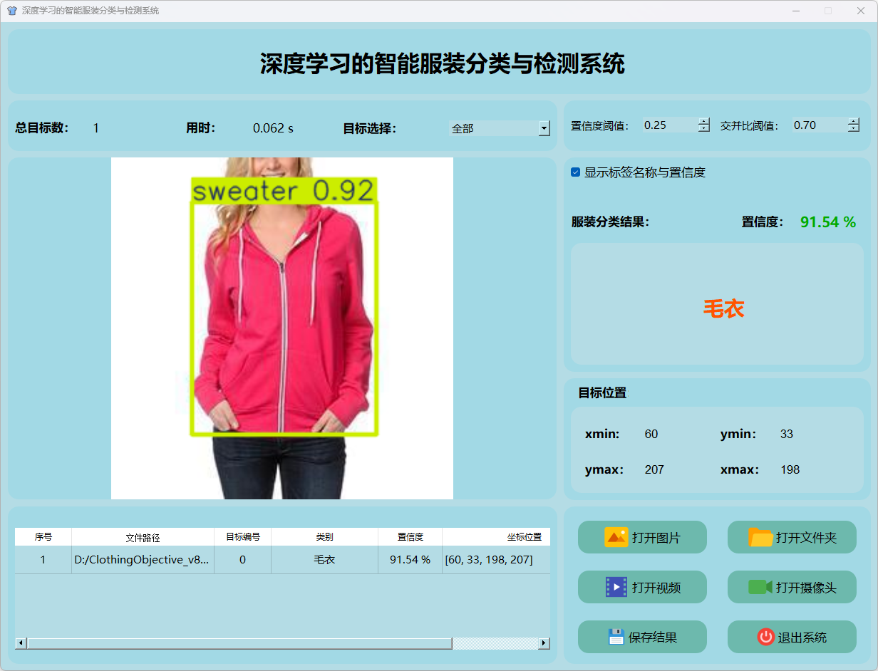 检测结果:系统识别出图片中的服装分类目标情况,并显示检测结果,包括总目标数、用时、目标类型、置信度、以及目标的位置坐标信息。
