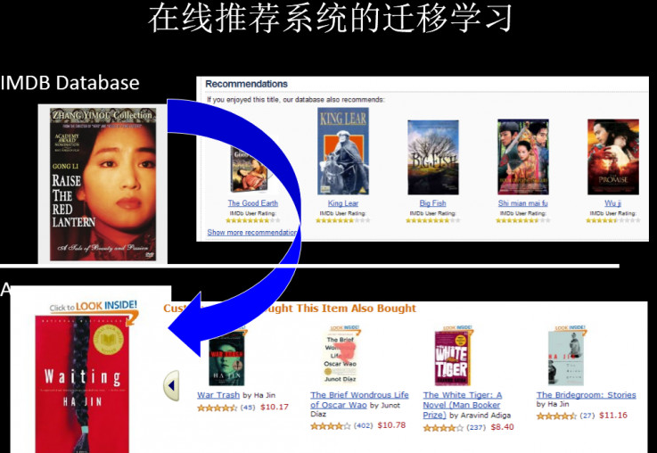 在线推荐系统中利用迁移学习,可以在某个领域做好一个推荐系统,然后应用在稀疏的、新的垂直领域。(影像资料——>书籍资料)