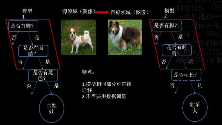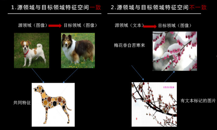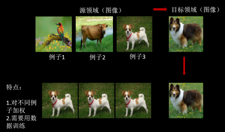 第二种为特征迁移,就是通过观察源领域图像与目标域图像之间的共同特征,然后利用观察所得的共同特征在不同层级的特征间进行自动迁移,上图左侧的例子就是找当两种狗在不同层级上的共同特征,然后进行预测。