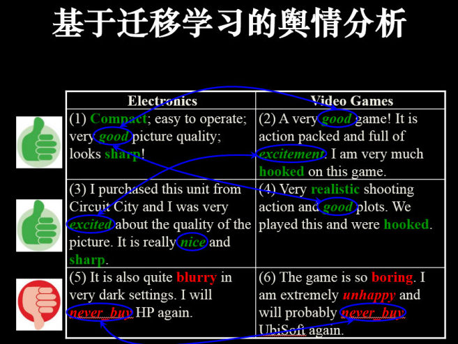 迁移学习也可应用在舆情分析中,如用户评价方面。以电子产品和视频游戏留言为例,上图中绿色为好评标签,而红色为差评标签。我们可以从上图左侧的电子产品评价中找到特征,促使它在这个领域(电子产品评价)建立模型,然后利用模型把其迁移到视频游戏中。这里可以看到,舆情也可以进行大规模的迁移,而且在新的领域不需要标签。