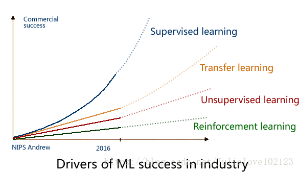 有一点是毋庸置疑的:迄今为止,机器学习在业界的应用和成功,主要由监督学习推动。而这又是建立在深度学习的进步、更强大的计算设施、做了标记的大型数据集的基础上。近年来,这一波公众对 人工智能技术的关注、投资收购浪潮、机器学习在日常生活中的商业应用,主要是由监督学习来引领。但是,该图在吴恩达眼中是推动机器学习取得商业化成绩的主要驱动技术,而且从中可以看出,吴恩达认为下一步将是迁移学习的商业应用大爆发。