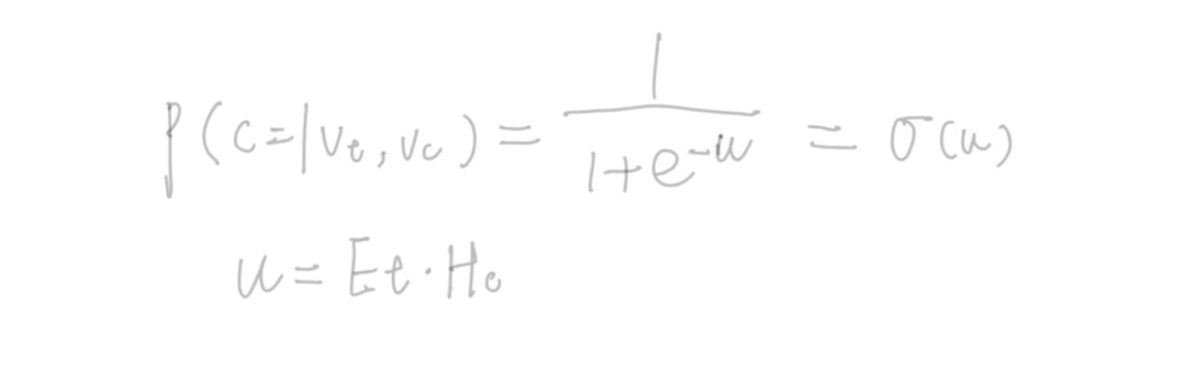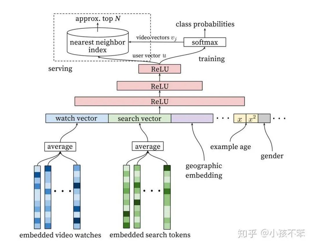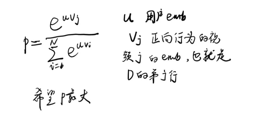 这个模型认为神经网络的最后一层输出(最后的ReLU输出)就是用户的Embedding表示,参与模型训练的同时会有一个视频embedding表示矩阵D(N*d),N是视频总数,d是视频embedding的维度,d和神经网络最后一层ReLU的输出维度一样(和用户Embedding维度一样)。假如用户u对视频j发生了正向行为(u和vj点击足够大,和负样本视频点击足够小),也就是下边的概率P最大化。