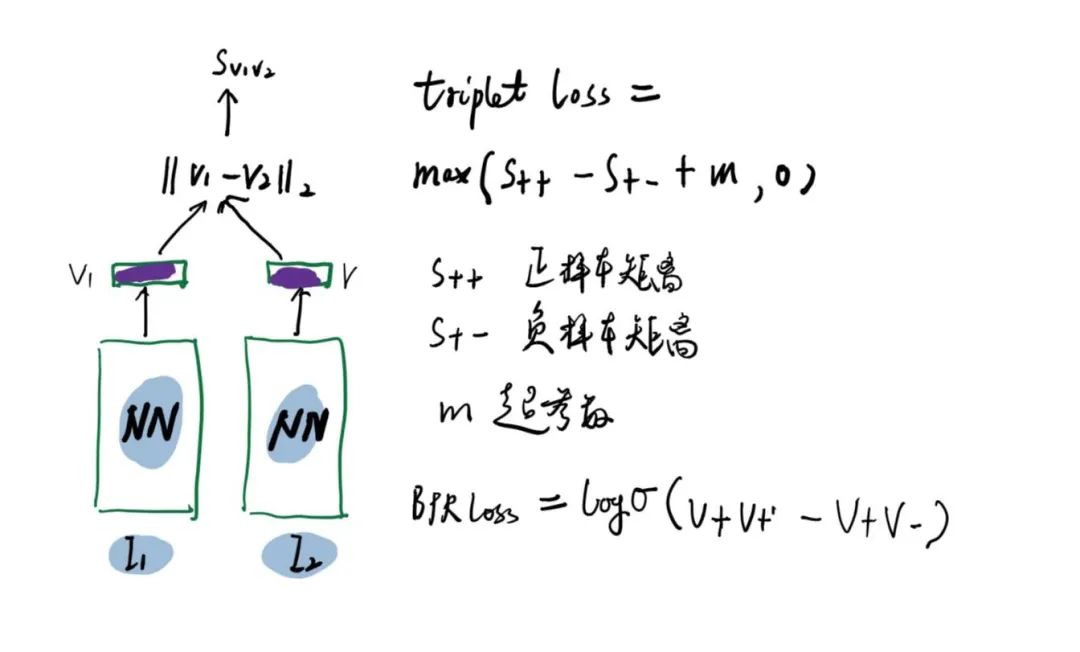物品经过NN(神经网络)编码后得到输出的向量,采用triplet loss时,希望正正样本之间的 距离足够小,正负样本样本之间 距离足够大 ,并且正负样本的距离差需要超过 。采用贝叶斯优化loss时,希望正正样本向量之间的点积足够大,正负样本向量之间的点积足够小。