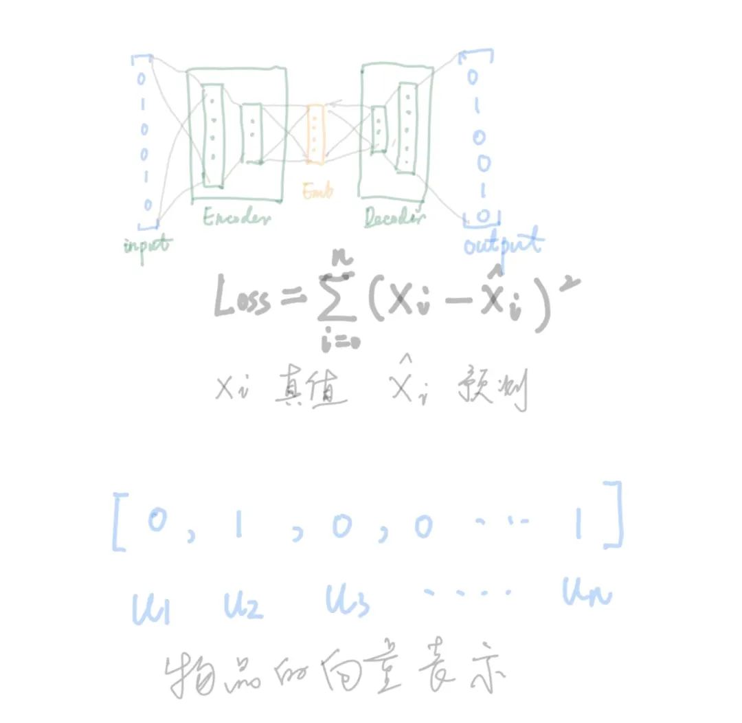 有了这种向量,我们就可以采用自编码器(Auto-Encoder)对原始向量压缩降维得到一个低纬度的向量,可用此低纬度的向量来表示召回物品,若下图所示: