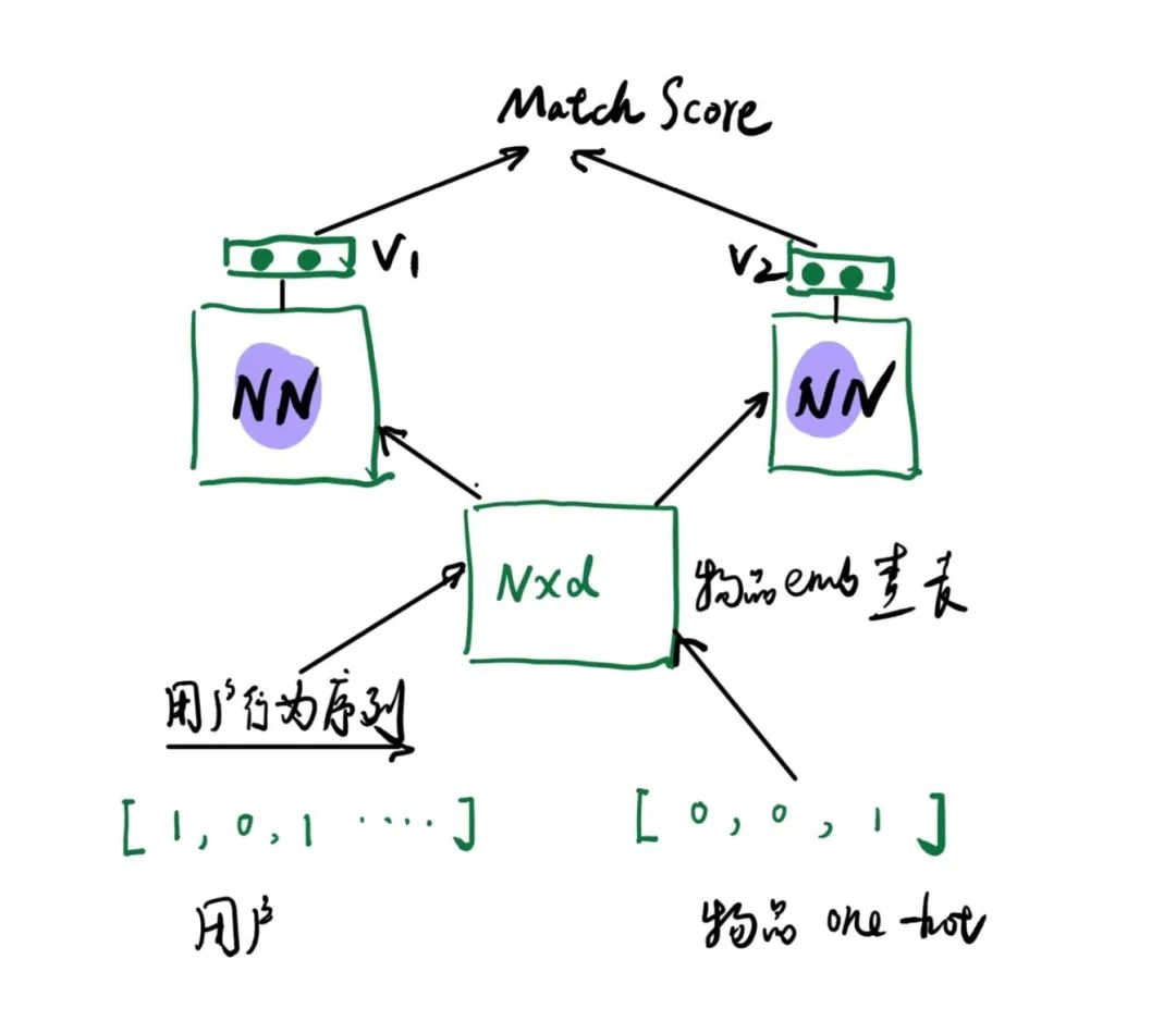在线匹配分数可以做的很简单(cosine或者l2 距离),通过优化可以在有限的时间进行大规模的计算,将候选池最大化。(具体优化在工程这一节会分享)