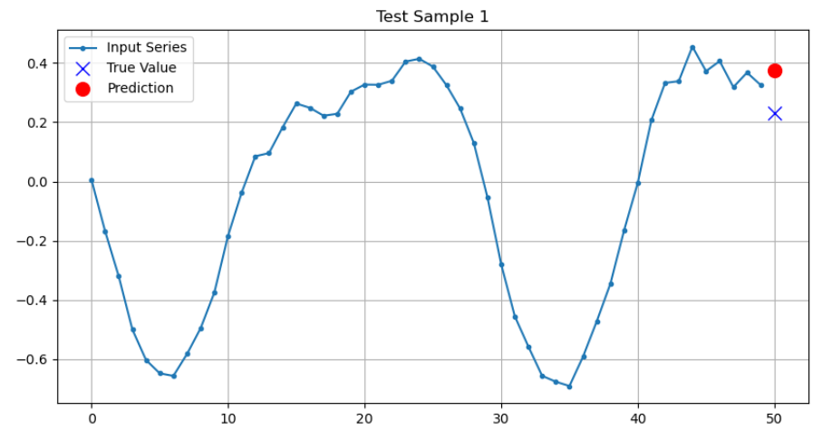 plot_series(X_test[i, :, 0], y_test[i, 0], y_pred[i, 0])