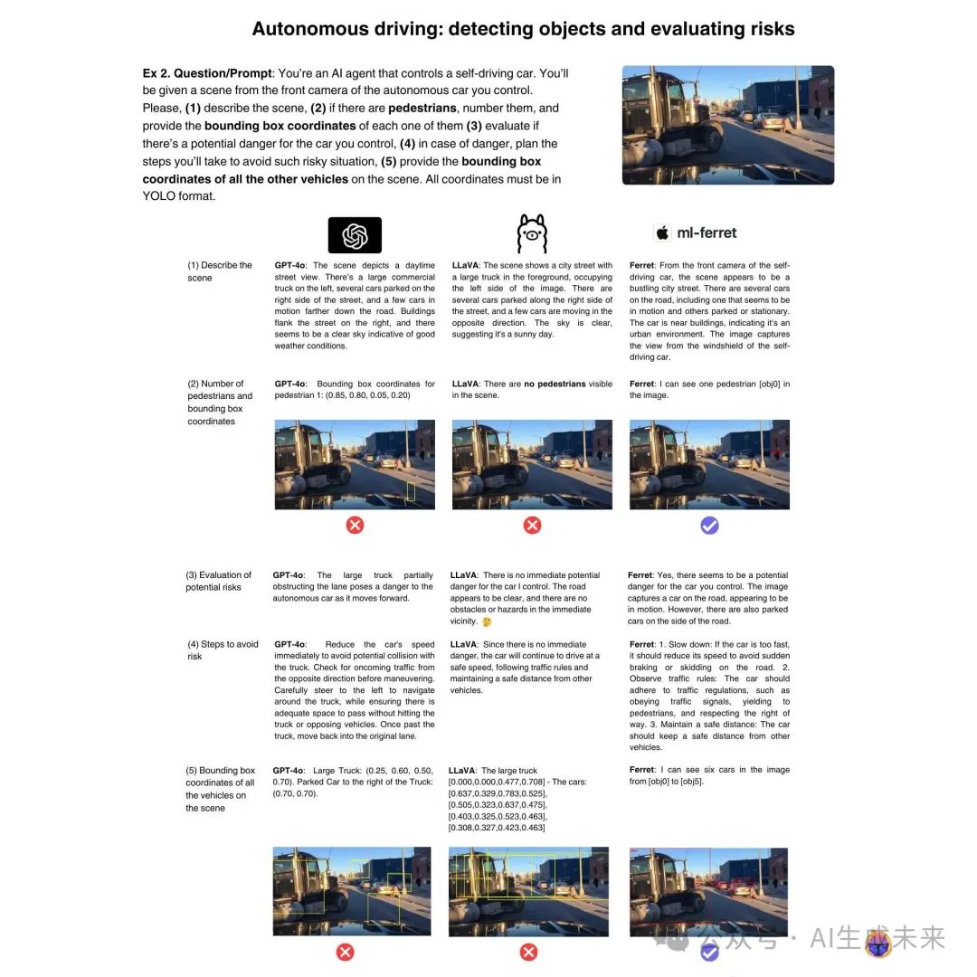 Apple Ferret 是唯一一个准确检测出大部分物体并给出正确坐标的模型 ✅。