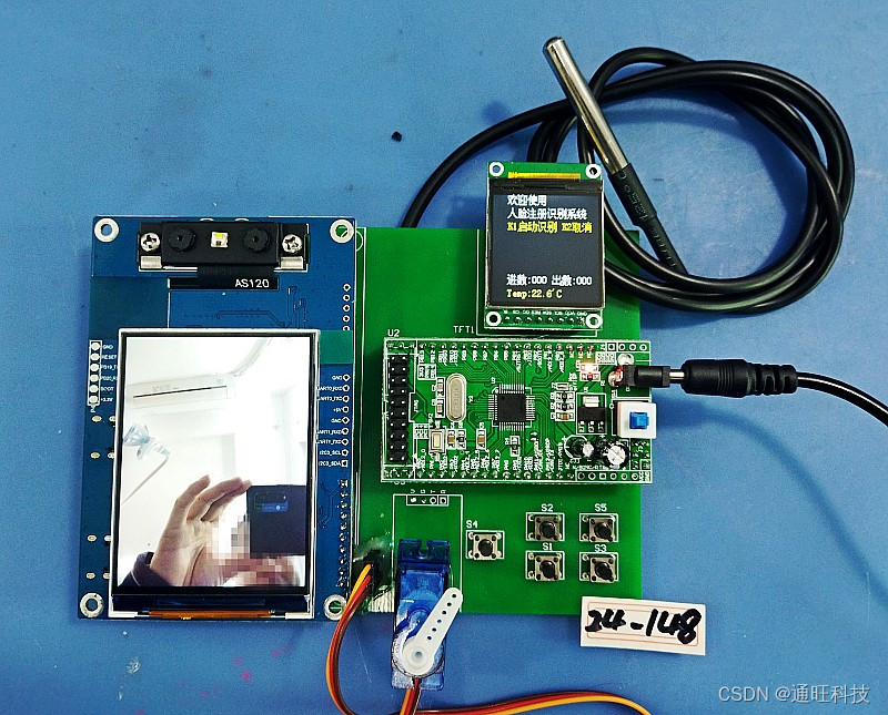 24-148、STM32人脸识别TX510系统安全门禁人流量检测设计+液晶显示DS18B20温度设计产品功能描述:本系统由STM32F103C8T6单片机核心板、1.44寸TFT彩屏、AI人脸识别双目活体辨别摄像头模块、舵机模块、按键、DS18B20温度检测及电源电路组成。【1】采用AI人脸识别双目活体辨别摄像头模块进行人脸数据采集,同时能够实现添加人脸特征、删除单个ID人脸信息、删除全部人脸信息