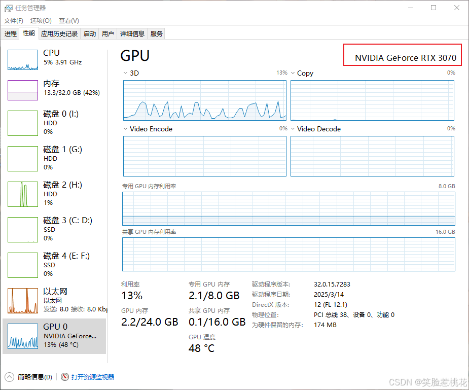 深度学习的训练对于电脑显卡要求较高,若电脑没有独立显卡(NVIDIA卡)或者是AMD的显卡无法使用GPU进行训练,需用CPU进行训练,会慢很多。若不清楚电脑有无显卡可以打开任务管理器,点击性能往下找GPU,就可以看到是否有独立显卡,不清楚是否为独立显卡则搜索型号。