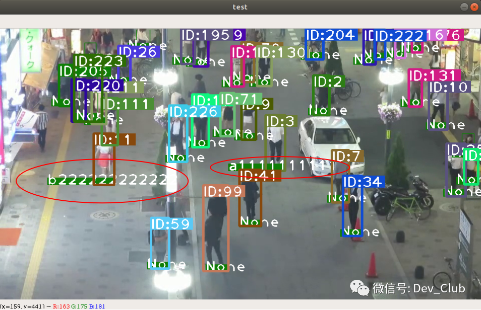 可以看到,由于事先已经提了2位行人(a1111111111和b222222222222)的特征,所以,画面中能够识别出这2个人并进行跟踪。默认,特征文件保存在fast_reid/query下