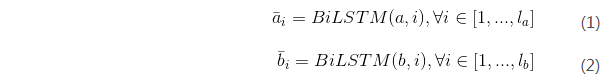 采用BiLSTM(双向LSTM)构建输入编码,使用该模型对输入的两个句子分别编码,表示如下(1)(2)所示: