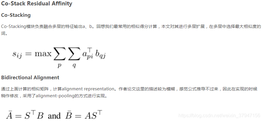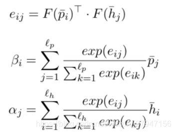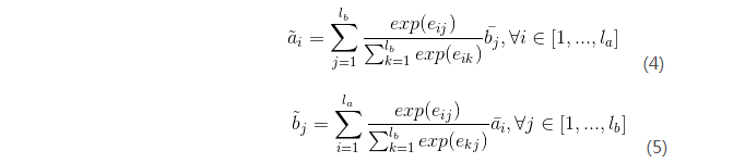 首先介绍inter-attention alignment layer,在之前的论文中,该attention已经被大量的应用。该attention主要计算两个文本词之间权重特征,通过另一个文本词向量加权来表示当前文本。