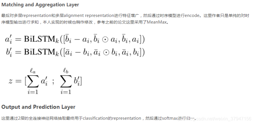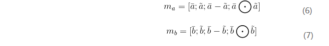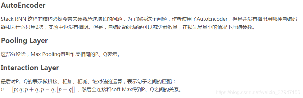 于是最后拼接起来的向量为 m=[p;h;p−h;p⋅h]m=[p;h;p−h;p⋅h]。注意一下这个拼接方式,因为后续的很多模型最后都是用这种拼接方法的类似方法来做的,足以见得这种方法的有效性。