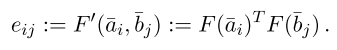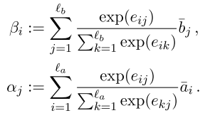 首先对a和b中的每个词计算它们之间的attention weights,计算公式如下: