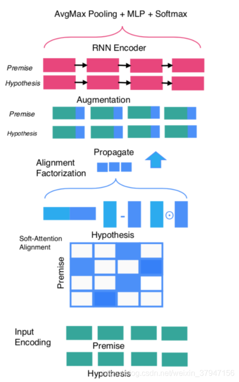 本文介绍论文《Compare, Compress and Propagate: Enhancing Neural Architectures with Alignment Factorization for Natural Language Inference》的相关工作,分别以co-attention和self-attention两个方向进行feature augment,然后在compare层引入factorization layer分别处理compare函数输出向量,最后通过一个时序模型对feature进行编码。