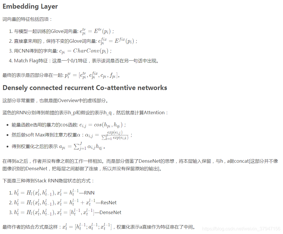 本文介绍论文《Co-Stack Residual Affinity Networks with Multi-level Attention Refinement for Matching Text Sequences》的相关工作,本文是CAFE算法的扩展版,CAFE算法只计算了one-layer,而本文作者则计算了multi-layer。事实上简单的stacked layer并不会带来太大效果的提升,甚至可能导致效果变差,为了训练深层次的网络,常用的三种网络结构为highway net、residual net、dense net。本文参考三种网络的设计方式,设计了一个网络更深的CAFE。但是本人在复现论文效果的时候发现参考论文的方式,一直达不到论文的效果,因此对论文中的模型结构稍作修改,将stacked-LSTM去掉,然后直接用highway做多层的CAFE投影,发现效果还不错。