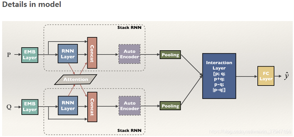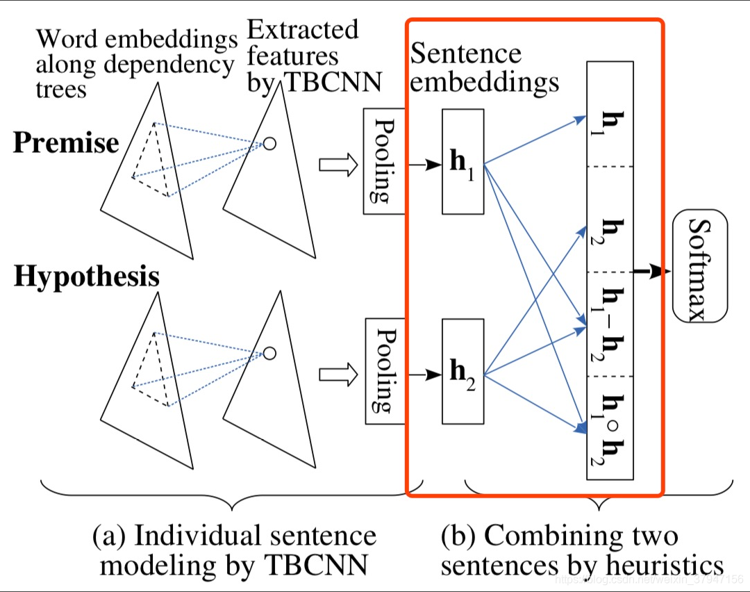 Tree-based CNN encoders注意这里红框内的拼接部分,除了对pp和hh做简单的拼接之外,还做了p−hp−h,p⋅hp⋅h的操作,作者给出的解释是:The latter two are certain measures of “similarity” or “closeness.”于是最后拼接起来的向量为m=[p;h;p−h;p⋅h]m=[p;h;...