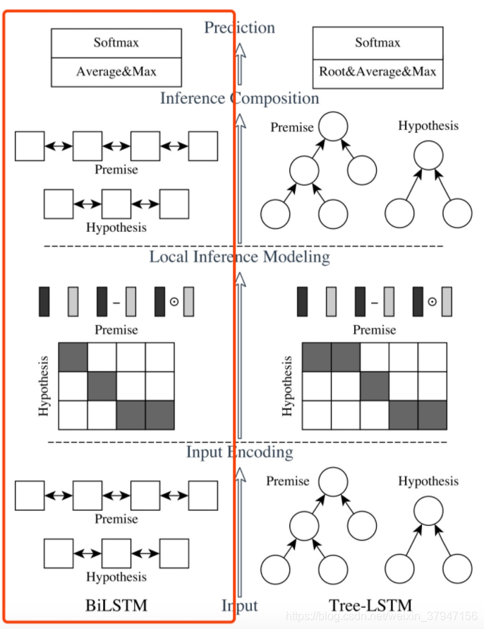 ESIM 模型出自 Qian Chen 等人发表在 ACL2017 上的 Enhanced LSTM for Natural Language Inference。也算是对 Decomposable Attention 的一个改进,然后它还加入了句法信息,组成了 HIM 模型,这种思想也为 NLI 后续的研究提供了一个思路。模型图如下所示,它的主要组成为:输入编码,局部推理建模和推理组合。图1中垂直方向描绘了三个主要组件,水平方向,左侧代表连续语言推断模型,名为ESIM,右侧代表在树LSTM中包含语法分析信息的网络。