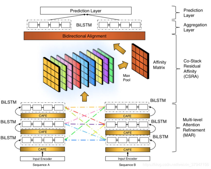 这里就比较简单了,直接讲上面讲到的CAFE作为block,参考类似于residual network的方式,输出为input + 6。6为CAFE中抽取的特征:inter-attention有3维,intra-attention有3维。