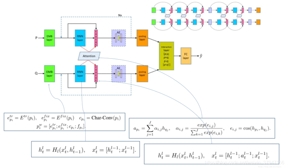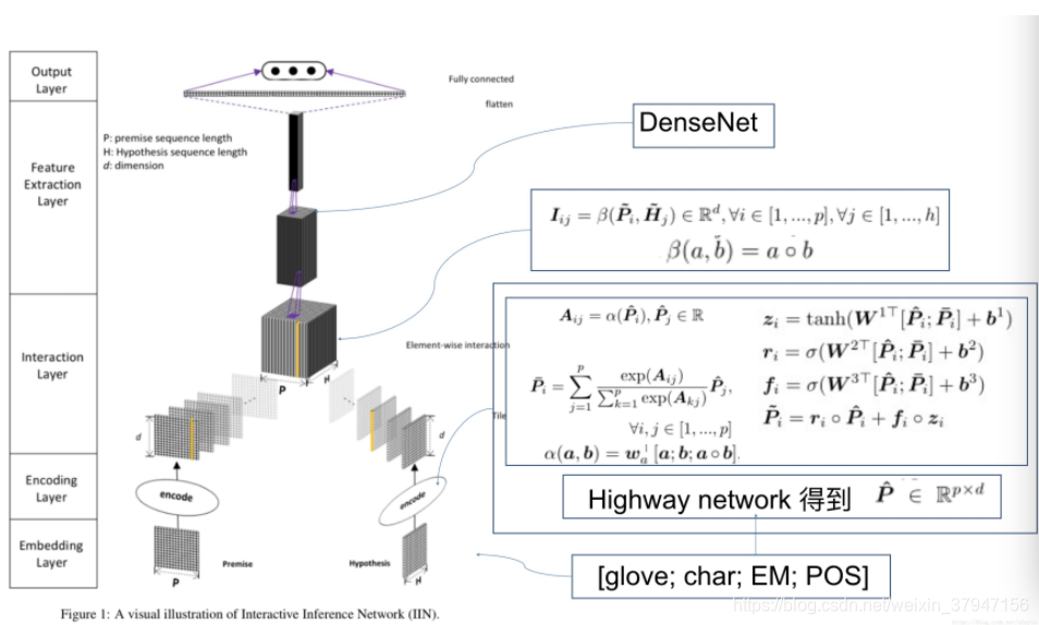 将上层得到的premise表示P和hypothesis表示H先通过一个两层的highway network得到Pˆ 和Hˆ 作为新的表示.